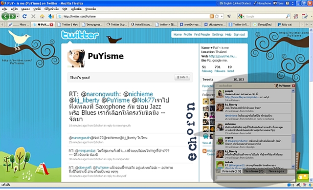 รูปล่างนี้เป็น Firefox Browser เปิดเว็บ Twitter/PuY แล้วด้านล่างขวาถ้าเราคลิ๊กที่ Icon จะมี Box ของ Ecofon ขึ้นมาทางขวาล่างนั่น เห็นมะ และไม่ว่าจะเปิดแท็บของ Browser ไปเว็บไหน Box ก็จะ Always on top อยู่ หรือจะซ่อนไว้ก็ได้นะ